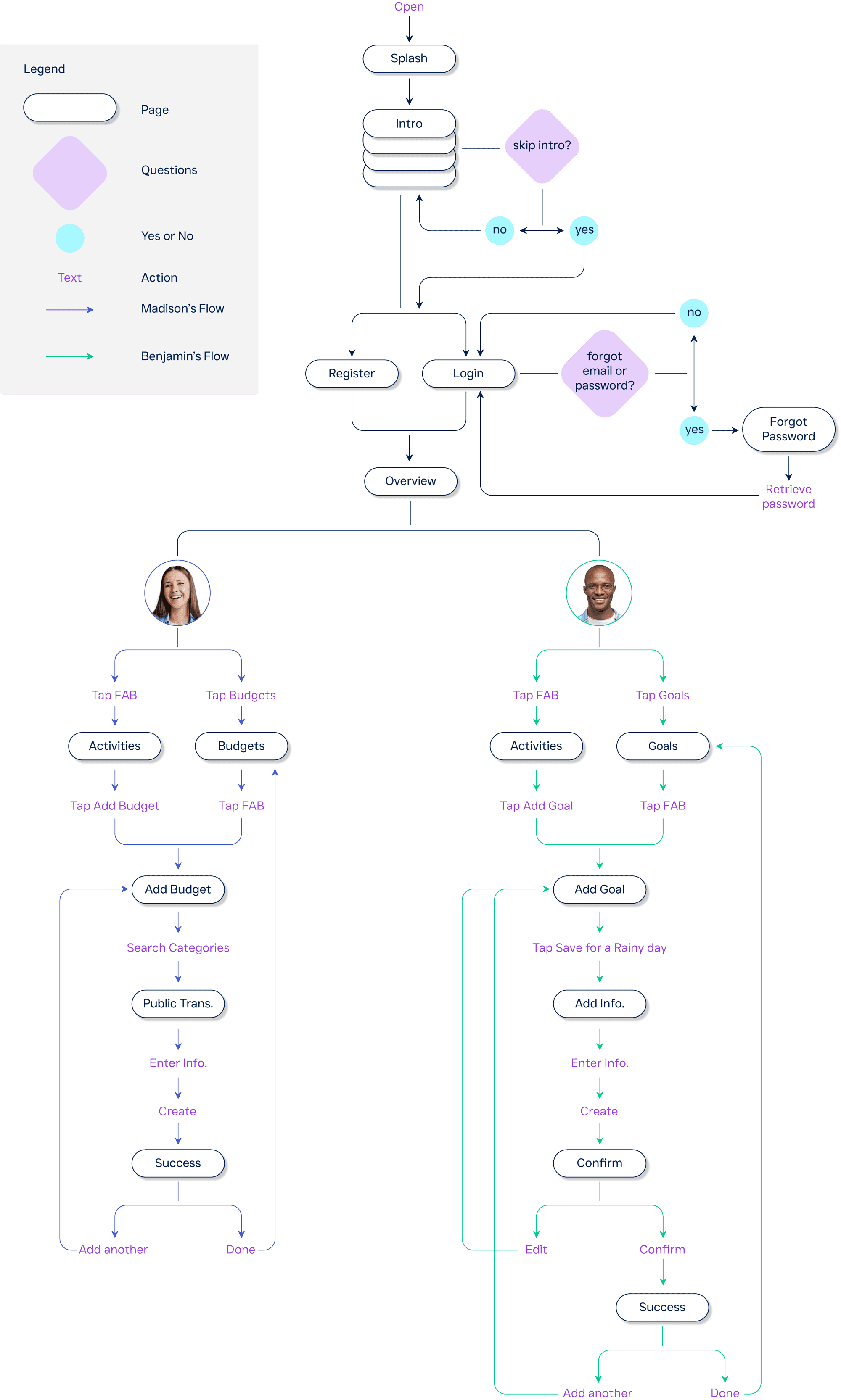 Based on research, I created design personas, Madison and Benjamin, to represent user behaviors, challenges, and goals. This helped me prioritize functionality and view the product from the user’s perspective.