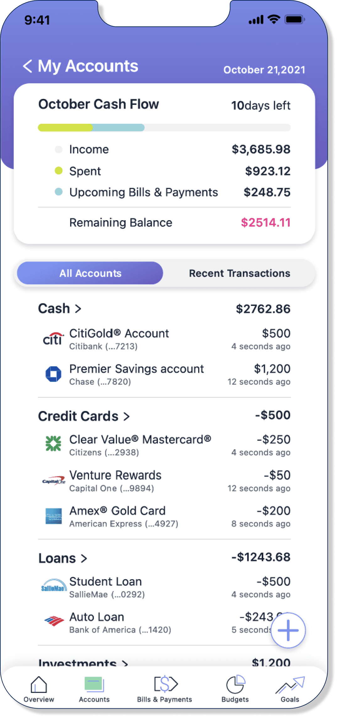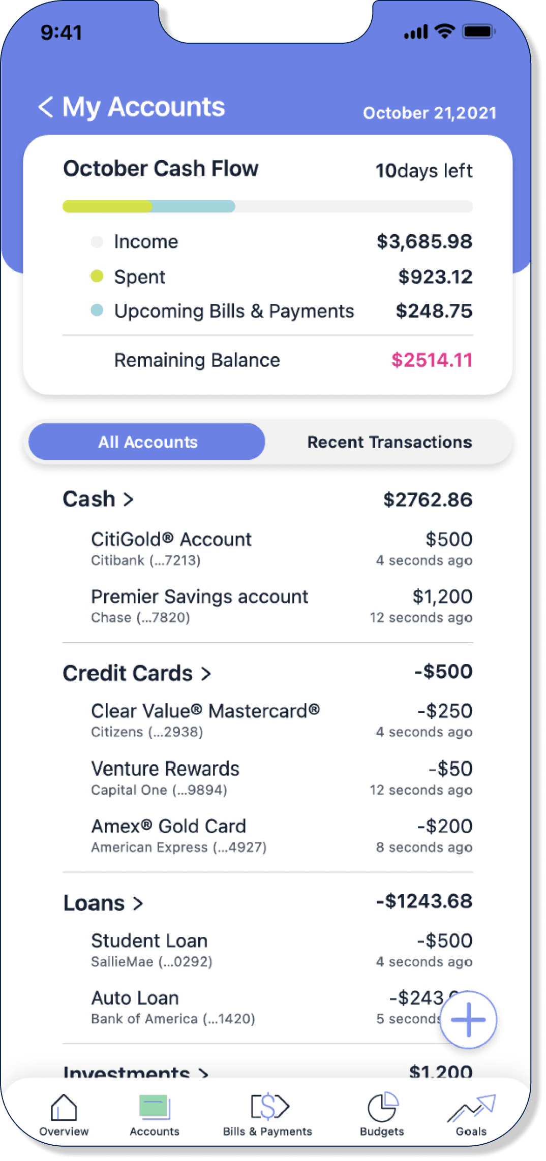 Summarizes cash flow, bills, budgets, and goals, with a FAB that provides quick access to common actions and detailed views.