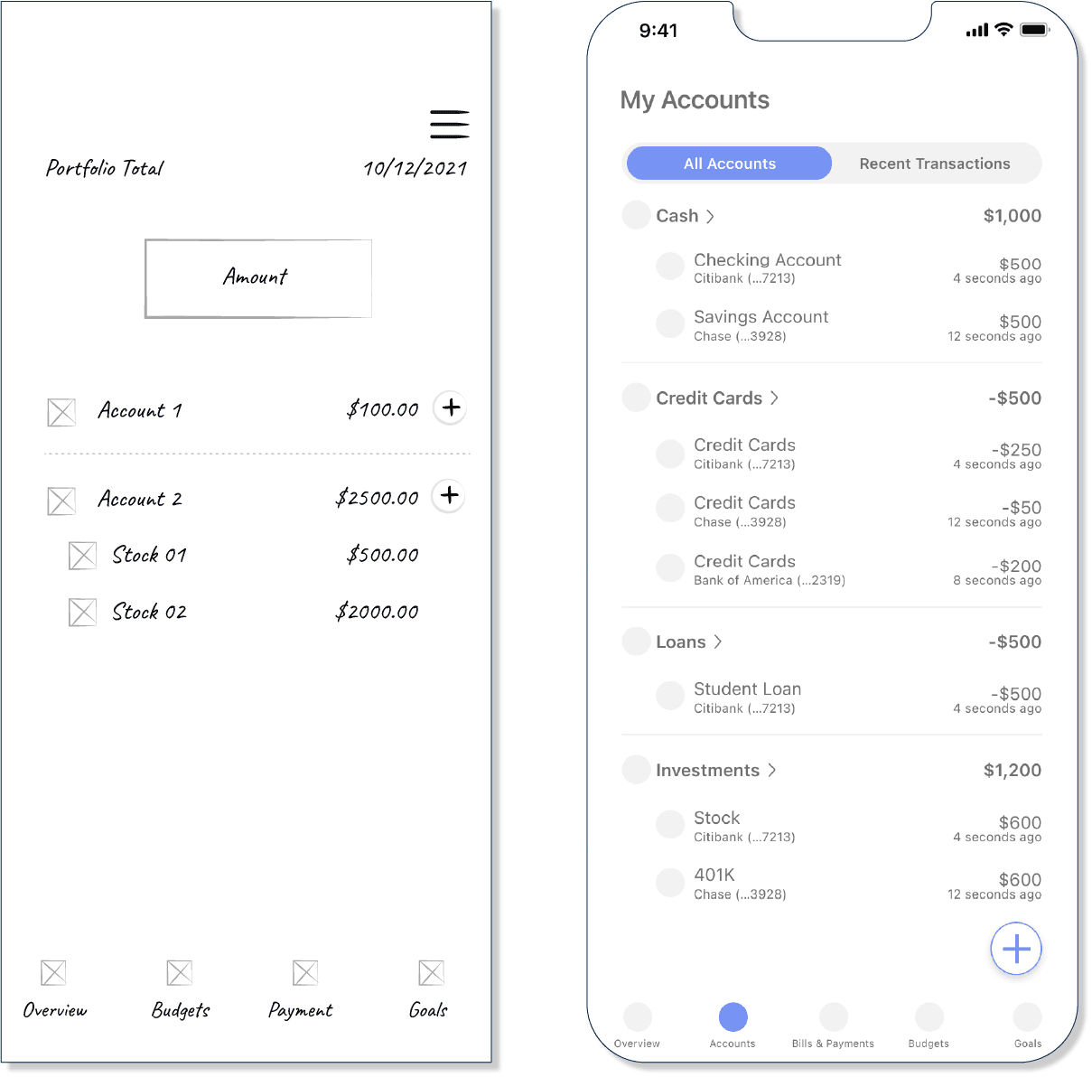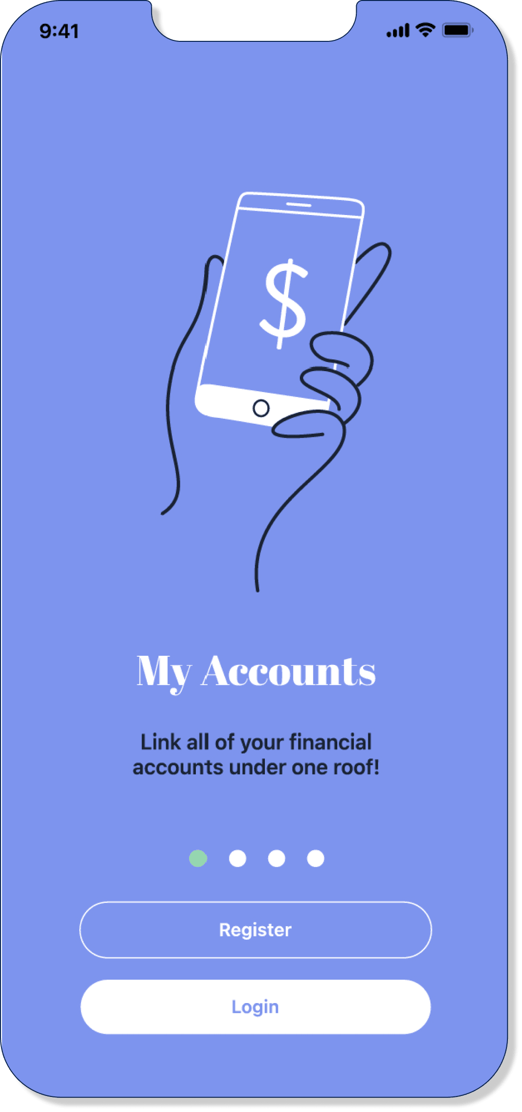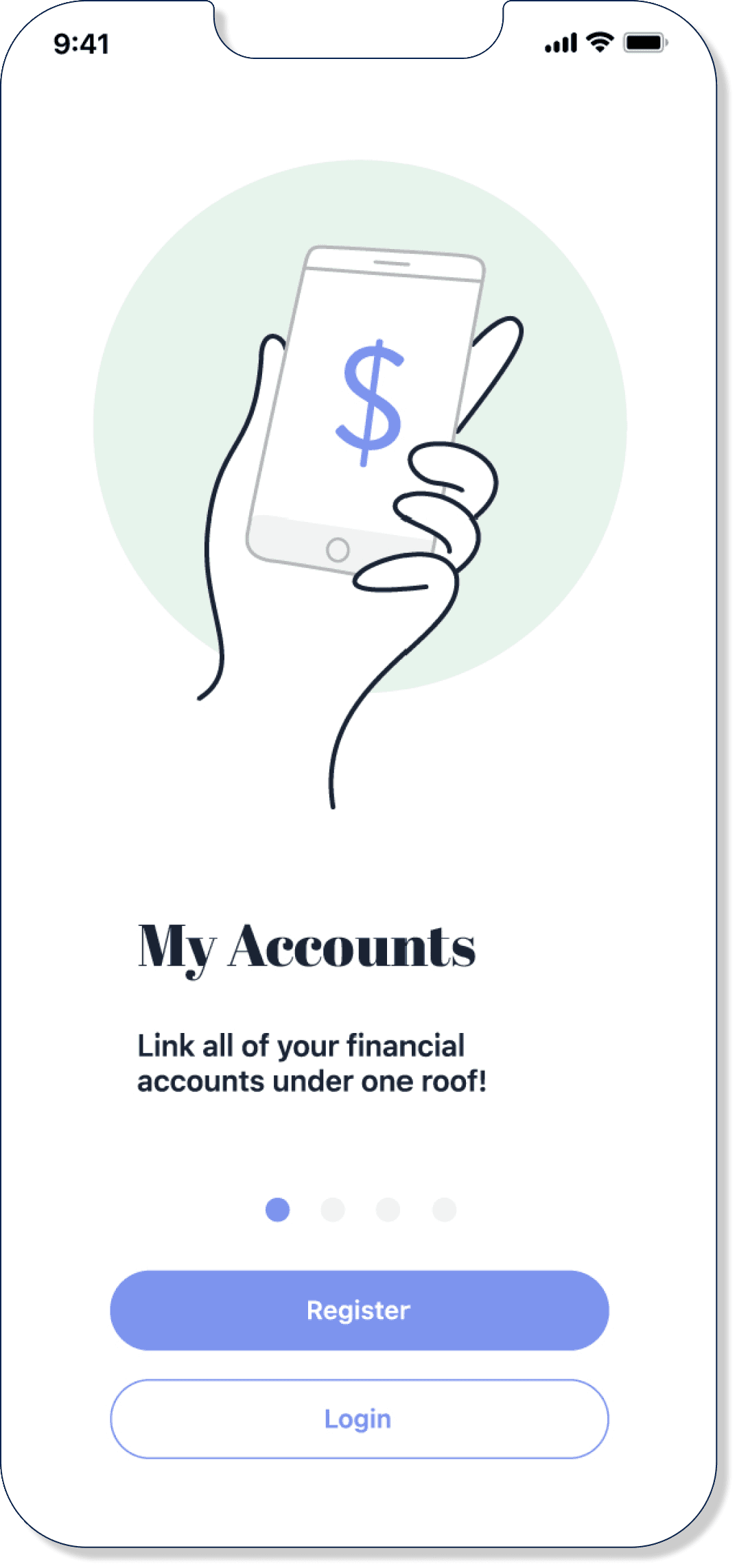 The My Account page provides a snapshot of the user's cash, credit cards, loans, and investments. Users can view detailed activity by selecting individual accounts or see all recent transactions in one place. A FAB makes it easy to link new accounts.
