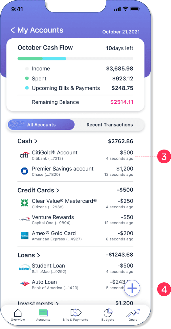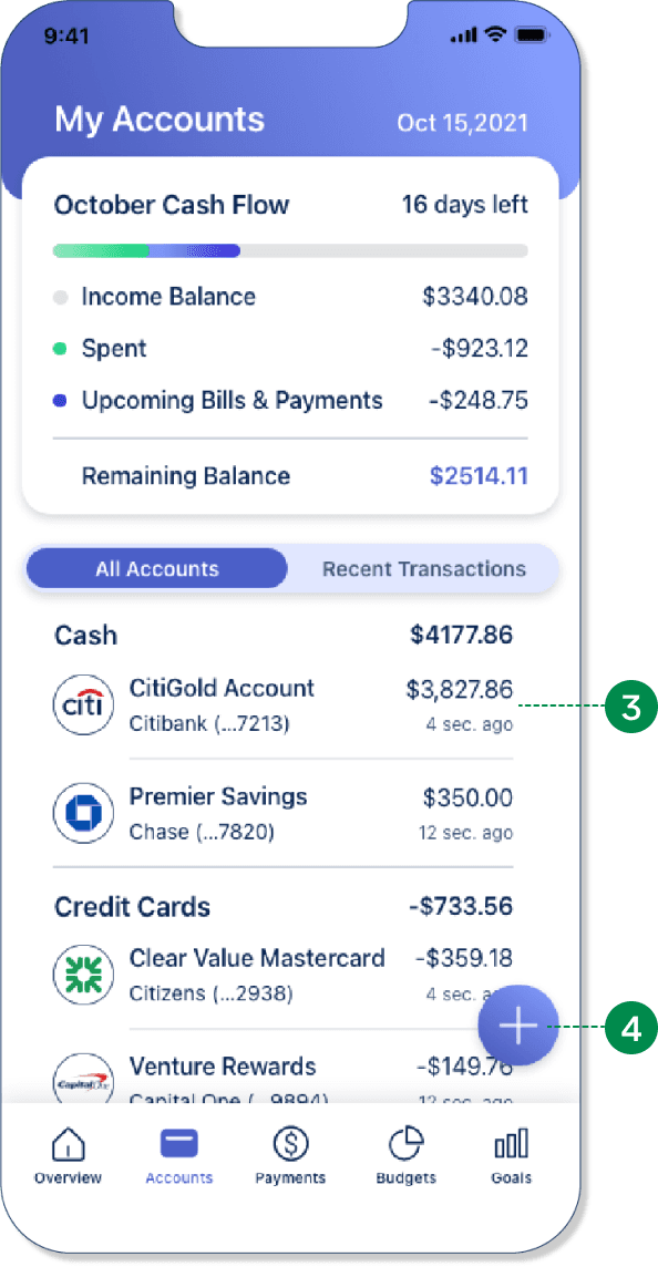 The financial overview provides a snapshot of cash flow, bills, budgets, and goals. Users can tap into detailed views or use the floating action button (FAB) to quickly link accounts, make payments, or add new budgets and goals.